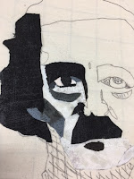 Little bits of fabric where glued onto a base sketch on muslin and then I used my machine to free motion thread sketch over that. It was so time consuming, but so worth it. Edgar now resides on my library wall along with other handmade and purchased pieces in his honor.